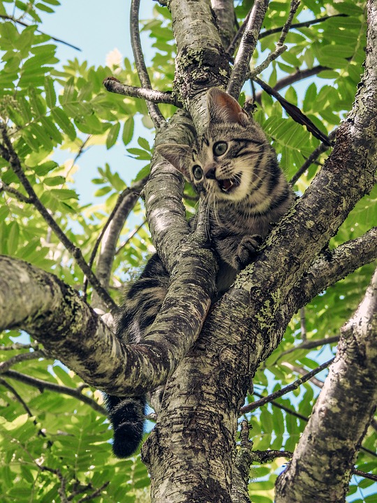 Sebastian moved carefully from the trunk to the branch below the squirrel nest. He tried to be quiet, but his breathing had now become a full pant. He had never been so hot. As he tried to reach up to the branch above, he lost his balance and began to fall. “Eyowl!” he screamed as he fell, but instinctively flipped in the air so he would land on his feet. THUMP! His descent was broken when he crashed onto one of the lower branches of the oak, belly first. He now hung there with his head down one side of the branch and his bottom down the other, not unlike a dish towel hung on a drying rack. “Huh, huh, huh,” he panted and tried to call out for help, while at the same time attempting to maneuver his paws onto the branch so he could dig his claws in for purchase and pull himself up. It was burning hot, his panting becoming more necessary to try to cool himself. This was a very uncatly predicament. What could he do? He knew his breathing was becoming more shallow as his weight settled his lungs into the branch. “Meyowl, meyowl.” No one could hear him.
